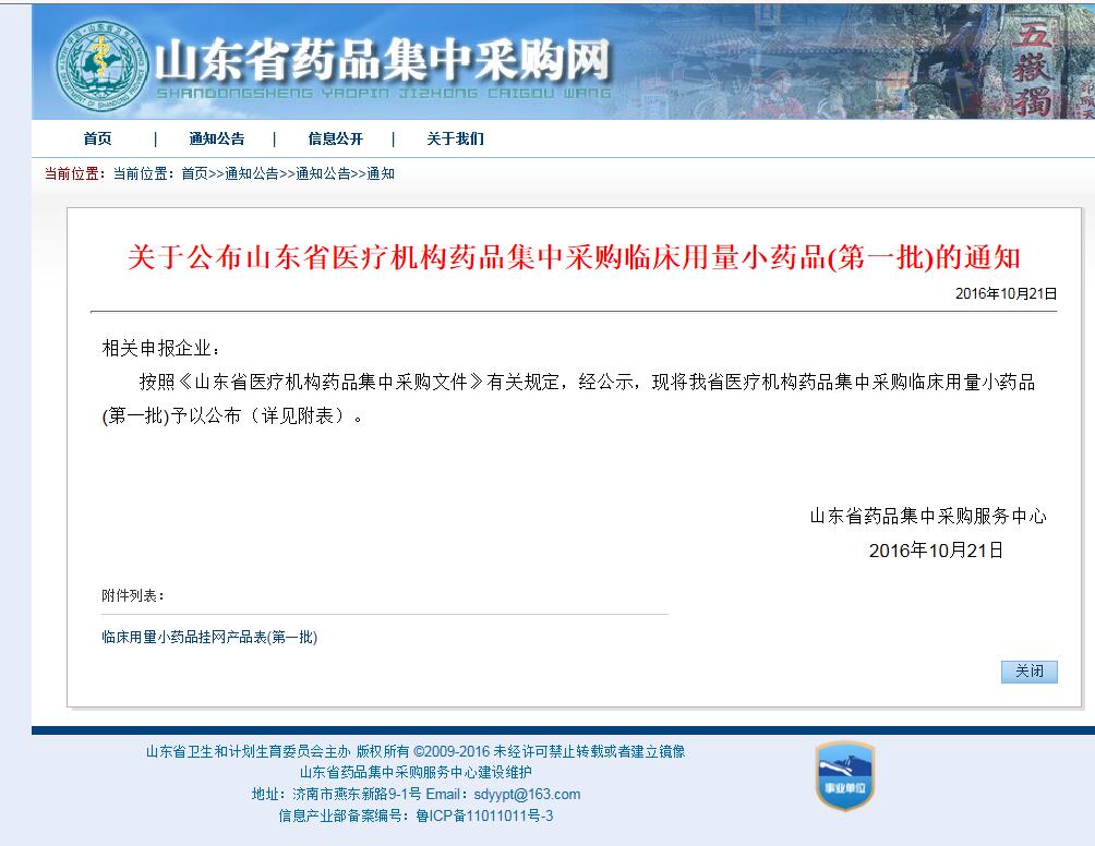 2016年9月20日《关于公布山东省医疗机构药品集中采购中标产品(第一批)的通知》,我司产品:胰激肽原酶肠溶片120单位*40片、60单位*60片中标;2016年10月21日《2016年山东省关于对医疗机构药品集中采购临床用量小药品(第一批)拟挂网公示的通知》中,注射用盐酸雷莫司琼、阿奇霉素分散片0.25g*6片、注射用细胞色素C成功挂网。